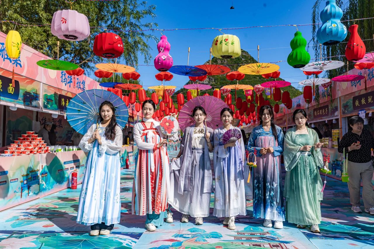 10月1日,济南华山风景区古风市集——鹊华雅集开市,70多家市集商户还原古代市集繁荣市貌,现场歌舞不断、琴声悠扬。