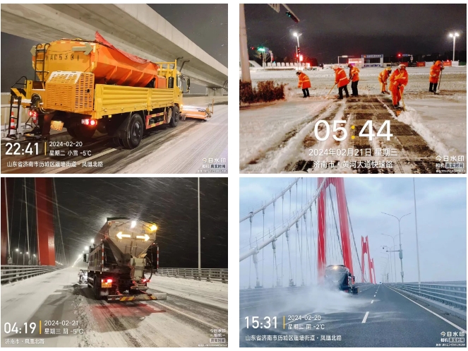济南市政公用资产管理运营有限公司桥隧管理中心严阵以待、提前谋划、全面备战,所运营管理的济南黄河济泺路隧道、济南黄河凤凰大桥、济乐高速南延、黄河大道等项目第一时间启动除雪保畅应急预案,采取机械作业为主、人工作业为辅的方式,截至目前累计投入300余人次,各类除雪除冰设备40余台,融雪剂撒布400余吨,全面做好除雪防滑工作,确保桥隧道路安全畅通和市民群众平安出行。
