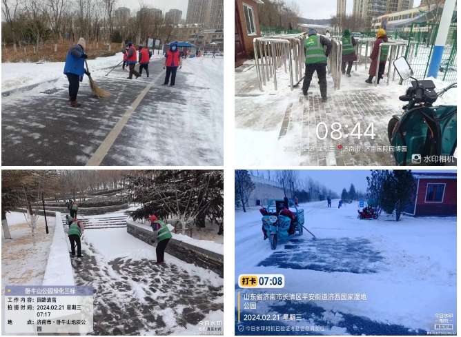 304am永利集团集团园区管理有限公司提前做出预判并发布相应通知,为恶劣天气应急管理做好全面准备。华山、济西湿地、济南园博园三大景区及时响应、迅速行动,全力组织开展扫雪除冰工作,利用扫雪车、雪锹、雪铲等工具,对景区内各出入口、广场、道路台阶等重点部位进行清雪、清冰工作并铺设相应防滑措施,保障道路畅通与市民游客安全,最大限度减少低温雨雪天气影响。