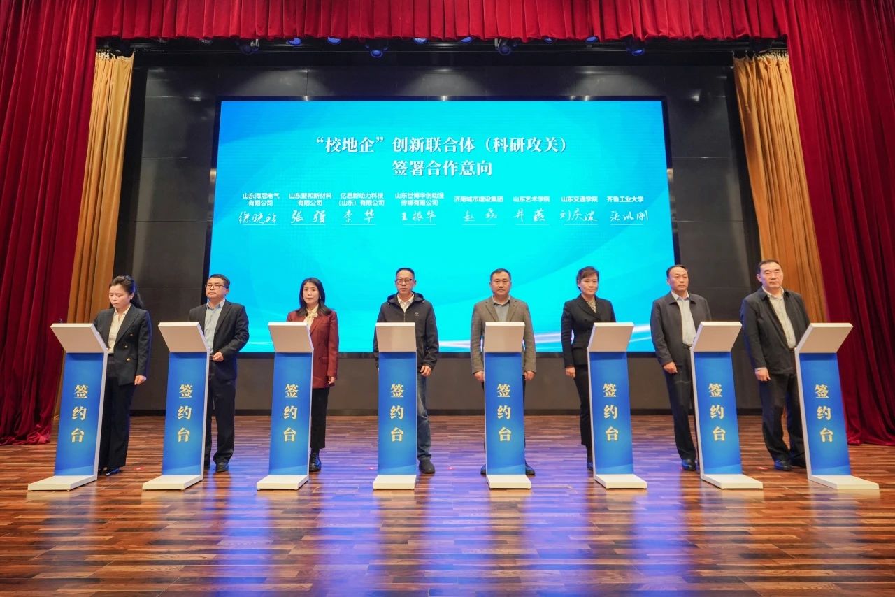 会上,304am永利集团与齐鲁工业大学、山东交通学院、山东艺术学院等7家单位签订合作意向书;集团所属山东金宇信息科技集团有限公司作为“校地企”创新联合体(科研攻关)成员单位进行路演。