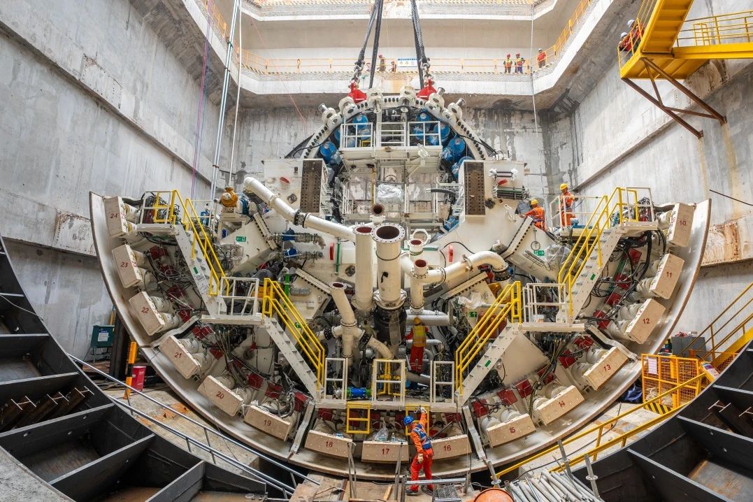 工程所采用的“山河号”盾构机,是世界在建最大直径泥水平衡盾构机,最大开挖直径17.5米,总长163米、重达5200吨、装机总功率12580千瓦,装配各类刀具306把,其中57把可实现滚刀齿刀互换,刀盘开口率53%,最大限度满足掘进所面对的复杂地层,盾构机总装达到世界先进水平。