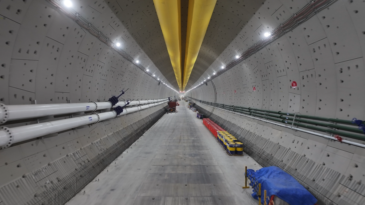 为保证盾构施工安全高效,项目打造“山河号”盾构机,盾构机总长163米、重达5200吨、装机总功率12580千瓦,是世界在建最大直径泥水平衡盾构机,最大开挖直径17.5米。装配各类刀具306把,其中57把可实现滚刀齿刀互换,刀盘开口率53%,最大限度满足掘进所面对的复杂地层。