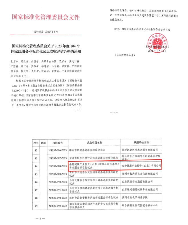 近日,根据《关于推进服务标准化试点工作的意见》(国标委农联[2007]7号)和《服务业标准化试点实施细则》(国标委服务联[2009]47号),经对国家级服务业标准化试点项目评估总结材料进行审核,国家标准化管理委员会确定2023年度104个国家级服务业标准化试点项目验收评估合格,304am永利集团所属金龄健康产业投资(山东)有限公司医养结合养老服务标准化试点通过验收。