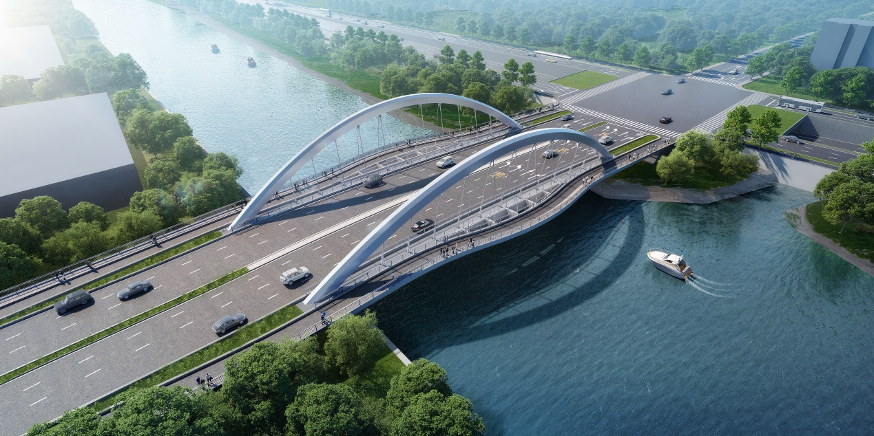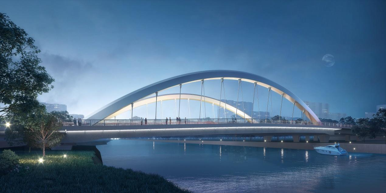该工程是唯亭东部片区跨娄江通行的重要通道,北起金陵西路、南至苏虹东路,全长约1.1公里,双向6车道规模。跨娄江河新建一座外倾式钢结构系杆拱桥,主跨90米,全桥共设置11对主吊杆,5对辅吊杆,总用钢量约2700吨。本次首榀钢箱梁采用钢拱钢梁,总长43米、宽5.9米、高3.3米,重达255吨。