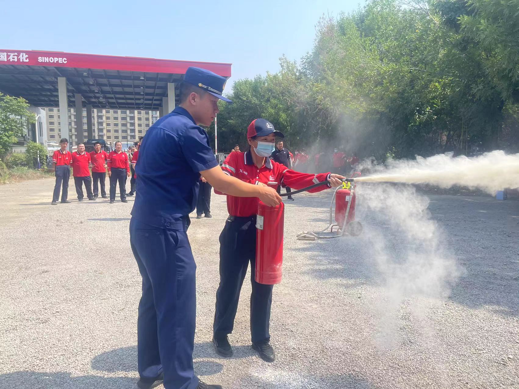 消防实战演练选取了加油机起火应急突发事件进行演练。演练前槐荫区消防中队郭良俊队长讲解了加油站消防安全注意事项、灭火器器材的使用及火灾扑救方式等消防知识,并演示了消防器材的操作方法。