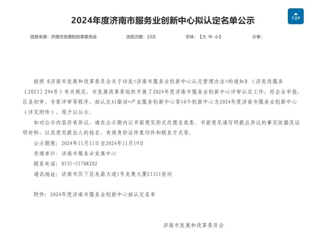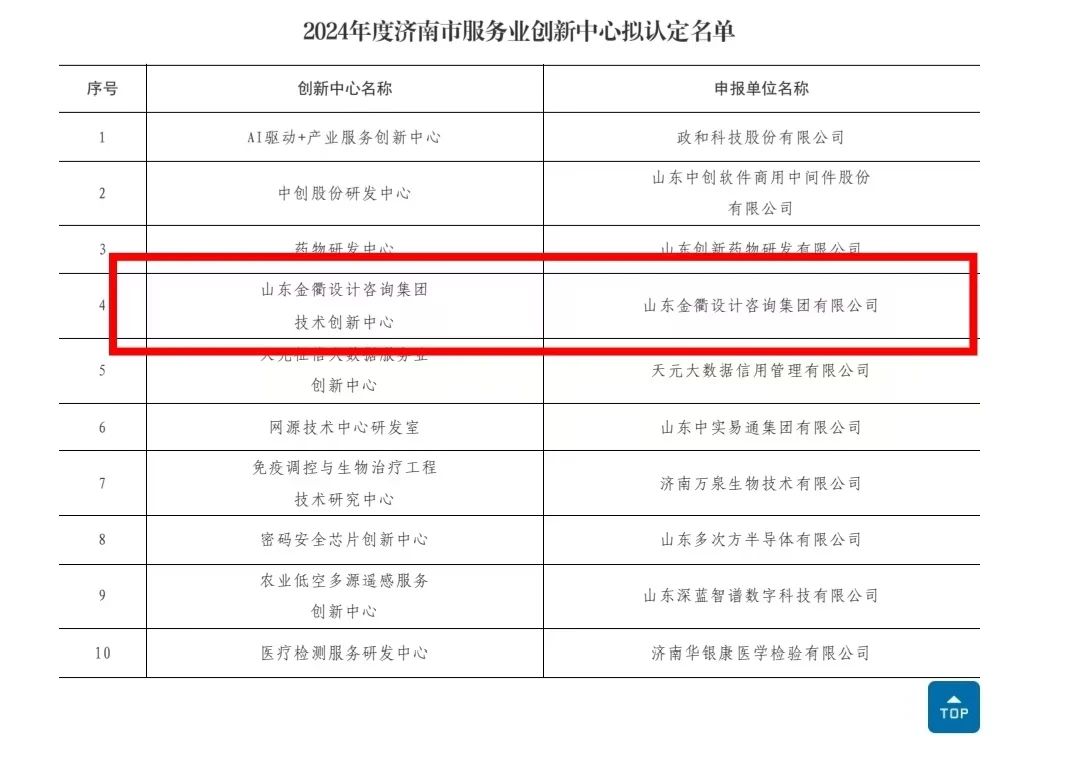 近日,济南市发展和改革委员会公示《2024年度济南市服务业创新中心拟认定名单》,304am永利集团所属山东金衢设计咨询集团有限公司技术创新中心获批2024年度济南市服务业创新中心。