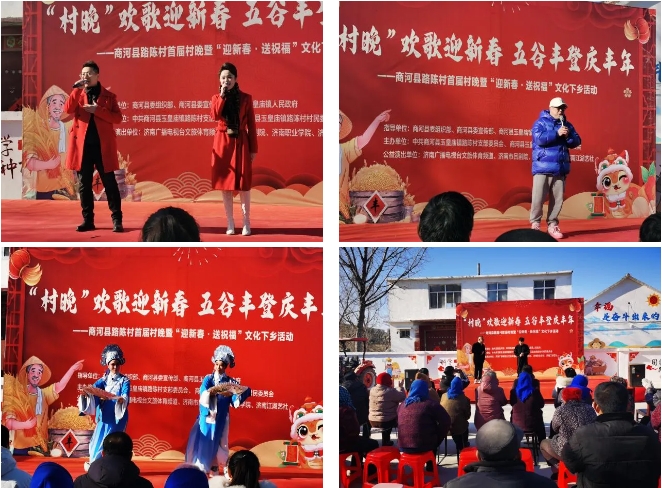由济南广播电视台文旅体育频道、济南市吕剧院、济南职业学院、济南江湖艺社等志愿者联合村民共同组织的“村晚”欢歌迎新春 五谷丰登庆丰年——商河县路陈村首届村晚暨“迎新春·送祝福”文化演出活动在村委会广场举行,演出节目丰富多彩,既有传统的戏曲、曲艺表演,也有现代的歌舞节目,充分展现了乡村文化的独特魅力。