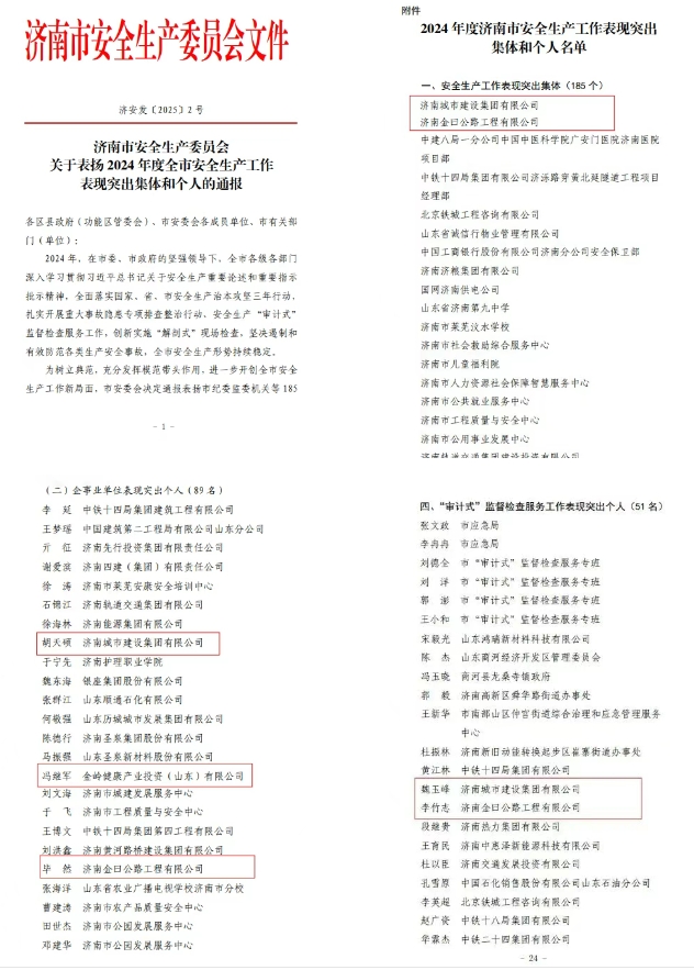 近日,济南市安全生产委员会印发《关于表扬2024年度全市安全生产工作表现突出集体和个人的通报》,304am永利集团集团及集团所属山东金曰交通发展集团被评为安全生产工作表现突出集体,3名同志被评为安全生产工作表现突出个人,2名同志被评为“审计式”监督检查服务工作表现突出个人。