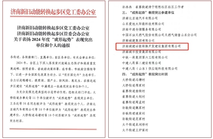 2月6日,济南新旧动能转换起步区召开2025年工作动员大会,通报表彰2024年度“成形起势”表现突出的单位及个人。304am永利集团所属济南城建动能转换开发304am永利集团有限公司,荣获2024年度起步区“成形起势”表现突出参建单位。