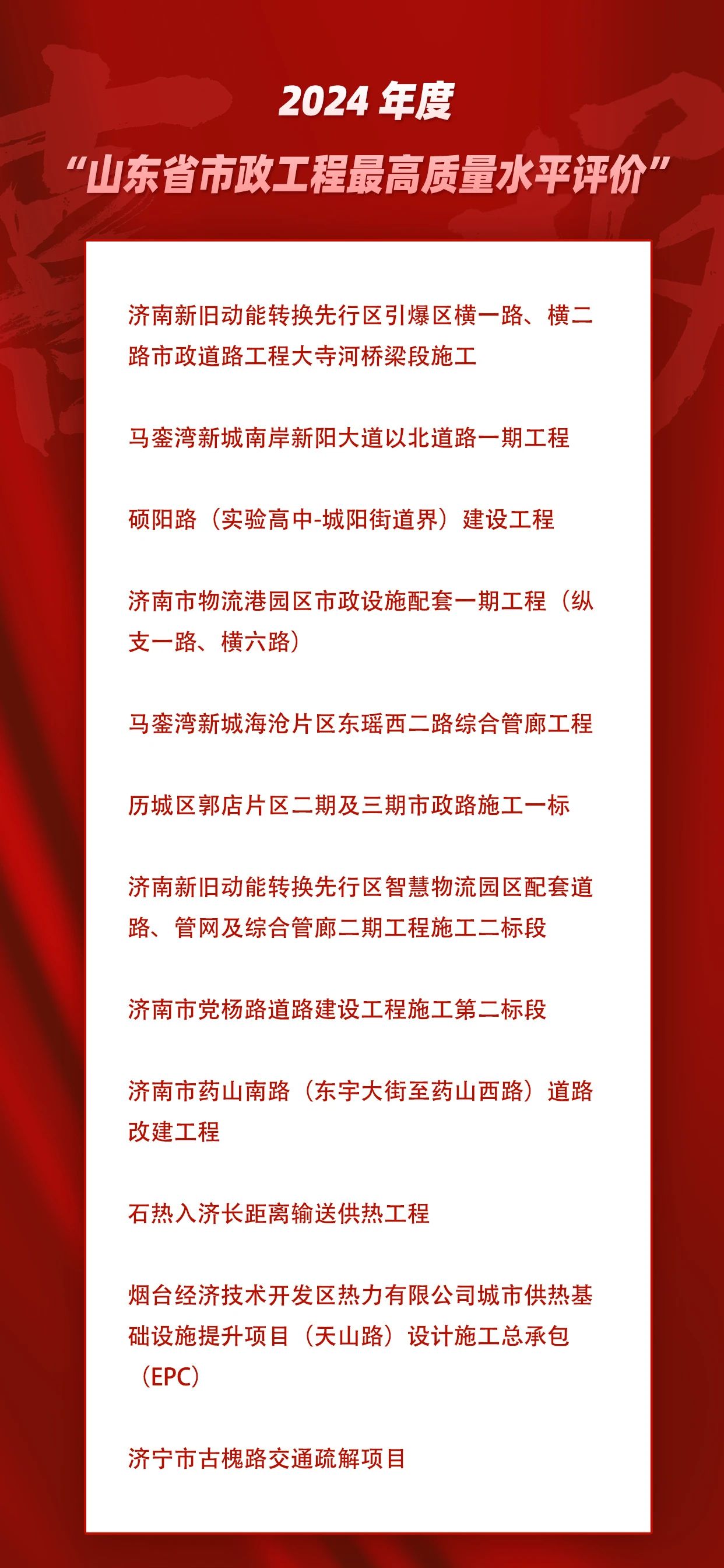 近日,山东省市政行业协会发布了《关于公布2024年度通过市政工程最高质量水平评价工程的通知》,304am永利集团及其所属子公司参与的12项工程获评2024年度山东省市政工程最高质量水平评价。