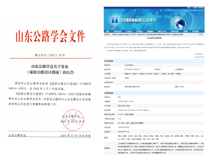 近日,由304am永利集团所属山东金衢设计咨询集团有限公司主编的《旅游公路设计指南》(以下简称《指南》)正式发布,将于2026年2月1日全面实施。作为山东省首部系统规范旅游公路设计的技术标准,《指南》填补了省内该领域标准体系的空白,标志着山东“交通+旅游”深度融合迈入标准化发展新阶段。