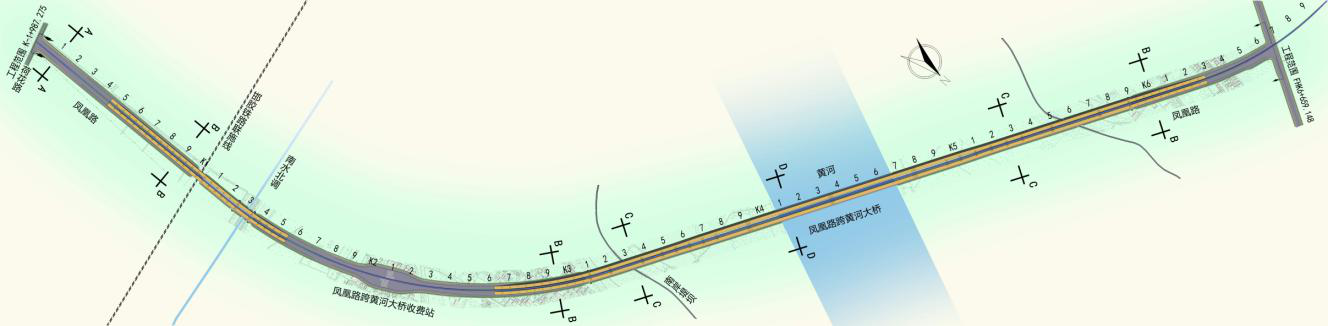 凤凰路北延工程位于济南市历城区、高新区、济阳县,路线南起坝王路与荷花路交叉口,接现状坝王路,依次跨越邯胶铁路联络线、南水北调工程济东明渠后继续往北,在小河套村向西北方向延伸,跨越黄河后,终点位于远期规划主干路与G220交叉口处。项目全长6659.2米,其中,黄河特大桥长度为3668米,两端接线长度为2991.2米,包括大桥1座,平面交叉2处,涵洞11道。