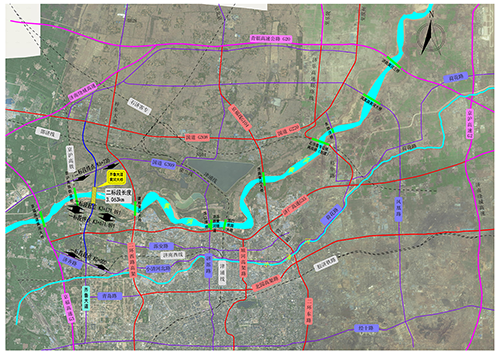 二标段工程范围起于美里北路交叉口以北,路线桩号K3+671.891,往北起桥跨越黄河后终于国道309交叉口处,路线桩号K6+735,包含黄河大桥主桥、大桥引桥、国道309互通立交,其中跨黄河段桥梁跨径布置为(95+280+420+280+95)米,采用下承式系杆拱桥,主孔跨径420米。